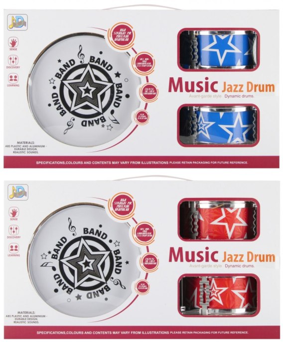 Zalety produktu: rozwija zdolności muzyczne dziecka już od najmłodszych lat, rozwija zmysł słuchu. Pozwól swojemu dziecku z perkusją MEGA CREATIVE rozwinąć kreatywność, poczucie rytmu, pasję lub wielki talent. Obecność muzyki jest bardzo ważna na rozwój dziecka. Koncentruję uwagę, uczy myślenia, wspomaga wyobraźnię Zestaw występuje w dwóch wersjach kolorystycznych: czerwony oraz niebieski. Zawartość zestawu: 3 bębny o różnej wielkości, 1 talerz, 2 małe pałeczki. Całość wykonana z plastiku oraz metalu. Wymiary/waga/baterie: wymiary produktu dł. x wys. x gł. cm : duży bęben- 16x10x16, mały bęben- 11x6x11, cała perkusja dł. x wys. gł. cm : 36x44x21, wymiary opakowania dł. x wys. x gł. cm : 34x20x13, waga produktu bez opakowania kg : 0,28 kg, waga produktu w opakowaniu kg : 0,49 kg, nie wymaga zasilania bateriami. Zestaw przeznaczony dla dzieci w wieku: 3 . Pakowany w karton z okienkiem. W kartonie zbiorczym po 12 szt.