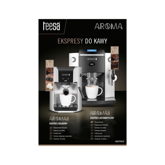 Wymiary: 68 x 98 cm (B1) Papier: kreda mat 130 g Marka: Teesa Treść: Teesa Aroma - Ekspresy do kawy