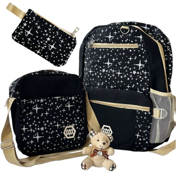 Zestaw składa się z czterech elementów (plecaka, torby, piórnika i misia), zapewniając kompleksowe wyposażenie dziecka na różne sytuacje szkolne - od codziennych lekcji po wycieczki czy zajęcia pozalekcyjne.