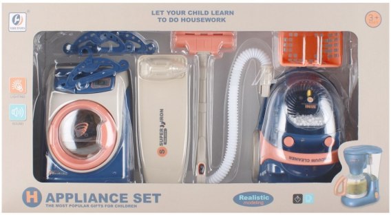 Zalety produktu: pralka posiada efekty dźwiękowe oraz świetlne, posiada otwierane drzwiczki bębna oraz wysuwaną szufladę na proszek, bęben pralki po włączeniu obraca się, po skończonym praniu można je wyciągnąć ze środka, odkurzacz posiada efekty dźwiękowe oraz świetlne, po włączeniu odkurzacza styropianowe kulki umieszczone w zbiorniku wirują imitując proces odkurzania. Najwyższy czas aby zrobić pranie oraz sprzątanie. Pozwól dziecku na wykonanie tej czynności domowej własnoręcznie we własnej pralce MEGA CREATIVE oraz odkurzyć własnym odkurzaczem. Produkty ten idealnie odzwierciedla prawdziwy sprzęt domowy Zawartość zestawu: pralka funkcyjna, kosz na pranie, 3 x wieszaki na pranie, deska do prasowania, żelazko, odkurzacz. Produkty wykonane z plastiku. Wymiary/waga/baterie: wymiary produktu dł. x wys. x gł. cm : pralka-10x14x8, odkurzacz-13x8x12, wymiary opakowania dł. x wys. x gł. cm : 41x22x10, waga produktu bez opakowania kg : 0,42 kg, waga produktu w opakowaniu kg : 0,68 kg, wymaga zasilania bateriami: pralka 3 x AALR06-nie załączono do zestawu, odkurzacz 2 x AALR06- nie załączono do zestawu. Zabawka przeznaczona dla dzieci w wieku: 3 . Pakowana w kartonik z okienkiem. W kartonie zbiorczym po 12 szt.