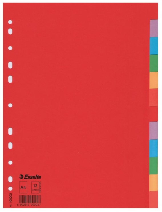 Przekładki Esselte z kolorowego kartonu. Przekładki i indeksy w 5 kolorach. Do segregowania dokumentów o formacie A4. Multiperforowane pasują do każdego segregatora. Z kartą lub bez karty informacyjno-opisowej. Wykonane z mocnego kartonu 160 gsm. Przekładki bez karty opisowej.