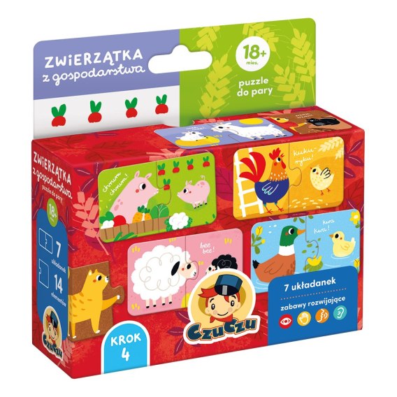 Edukacyjny zestaw sprawdzi się jako pierwsze puzzle dla maluchów. W poręcznym pudełeczku znajdziecie 7 dwuelementowych układanek z uroczymi, pełnymi ciepła i humoru ilustracjami. Przedstawiają małe i duże zwierzątka ze wsi i inspirują do mnóstwa wesołych zabaw.