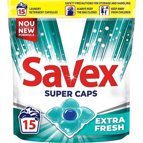 Savex Super Caps Extra Fresh kapsułki do prania tkanin jasnych i białych skutecznie usuwa zabrudzenia, dba o kolory tkanin i kształt Twoich ubrań pozostawiając atrakcyjny zapach. Zapewnia świeżość i delikatność. Nowa formuła produktu Savex Caps dzięki technologii Power Clean Booster zwalcza nawet najtrudniejsze plamy a zastosowana formuła Brightnes Activator sprawia, że biel staje się jeszcze bielsza a kolory bardziej intensywne. Kapsułki Savex to produkt do prania tkanin jasnych i białych w temperaturach już od 20°C do 60°C w pralkach automatycznych. Dostępne w dwóch rodzajach.