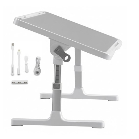 ✅ Technologia SmartDrawer™ to wbudowana, wysuwana szuflada na kable, myszkę, pendrive'y czy okulary, która pomaga utrzymać idealny porządek. System USB-Link zapewnia stały dostęp do zasilania bezpośrednio przy stoliku. Specjalna podpórka zabezpiecza laptopa przed zsuwaniem się z blatu, nawet przy większym kącie nachylenia. W zestawie znajduje się także lampka USB do wieczornego czytania oraz mini wiatraczek, który zwiększa komfort pracy w cieplejsze dni.