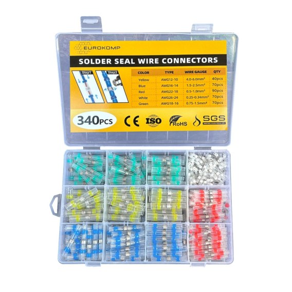 Złączki do kabli wykonane są z cyny lutowniczej, koszulki termokurczliwej oraz termoplastycznego kleju.