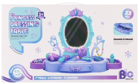 Zalety produktu: Toaletka z akcesoriami MEGA CREATIVE. Spełnij marzenia małej elegantki Toaletka z akcesoriami to wyjątkowy zestaw do zabawy, który pozwala dzieciom poczuć się jak prawdziwa księżniczka. Stylowa toaletka z lusterkiem i bogatym zestawem akcesoriów sprawi, że codzienna zabawa zamieni się w bajkową przygodę. Elegancki design kolorowa toaletka z ozdobnymi detalami i bezpiecznym lusterkiem. Bogaty zestaw akcesoriów w komplecie znajdziesz grzebień, suszarkę, kosmetyki zabawkowe, biżuterię i inne dodatki. Funkcje interaktywne tj. świecące elementy, dźwięk. Bezpieczne materiały lekkie i trwałe, odpowiednie dla dzieci. Toaletka z akcesoriami to idealny prezent na urodziny, święta czy Dzień Dziecka. Dzięki niej każda mała dama będzie mogła tworzyć własne stylizacje i spędzać godziny na twórczej, radosnej zabawie. Zawartość zestawu: toaletka z lusterkiem świecącym i grającym melodyjki, z szufladką i bocznymi półeczkami, akcesoria tj. suszarka, lokówka, spinki do włosów, lakier do paznokci, naszyjnik, bransoletka. Wszystkie akcesoria wykonane z plastiku i są imitacją prawdziwych. Wymiary/waga/baterie: wymiary opakowania dł. x wys. x gł. cm : 51x30x16, wymiary produktu: dł. x wys. x gł. cm -skrzydła 47x25x80, waga produktu bez opakowania kg : 0,90 kg, waga produktu w opakowaniu kg : 1,58 kg, wymaga zasilania bateriami 2x AALR06-nie załączonymi do zestawu. Zestaw przeznaczony dla dzieci w wieku: 3 . Pakowany w kartonik. W kartonie zbiorczym po 12szt.