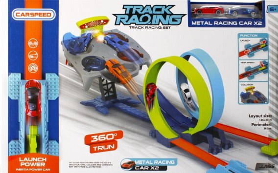 Zalety produktu: tor posiada wyrzutnię oraz dwie pętlę dzięki czemu jazda jest atrakcyjniejsza. MEGA CREATIVE przedstawia idealne rozwiązanie dla miłośników torów samochodowych. Tor samochodowy z metalowymi samochodami wyścigowymi, zapewni sporą dawkę zabawy z uśmiechem na ustach Posiada efekty świetlne. Tor wyścigowy w postaci wyrzutni pętli. Należy umieścić w wyrzutni samochód który rozwinie prędkość i okrąży pętle o 360 stopni Niesamowita prędkość i zwinność tych małych samochodzików. Uwaga by nie doprowadzić do kolizji Zawartość zestawu: tor do samodzielnego montażu, 2 x samochody. Całość wykonana z plastiku i metalu. Wymiary/waga/baterie: długość toru cm 382 cm, wymiary produktu dł. x szer. cm : 136x37, wymiary opakowania dł. x wys. x gł. cm : 61x38x9, waga produktu bez opakowania kg : 0,79 kg, waga produktu w opakowaniu kg : 1,16 kg. Wymaga zasilania bateriami 2x AALR06 -nie załączonymi do zestawu. Produkt przeznaczony dla dzieci w wieku: 6 . Pakowany w kartonik z okienkiem. W kartonie zbiorczym po 12 szt.