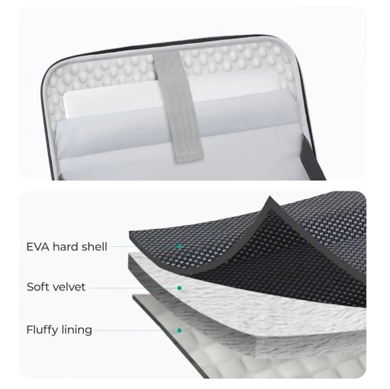 Wnętrze torby wykończono miękkim welurem oraz puszystą wyściółką, które zapobiegają zarysowaniom obudowy laptopa. Funkcjonalny system przechowywania obejmuje wyściełaną komorę główną, siateczkowe przegrody na akcesoria, a także odpinany pasek stabilizujący, dzięki któremu sprzęt pozostaje bezpiecznie unieruchomiony.