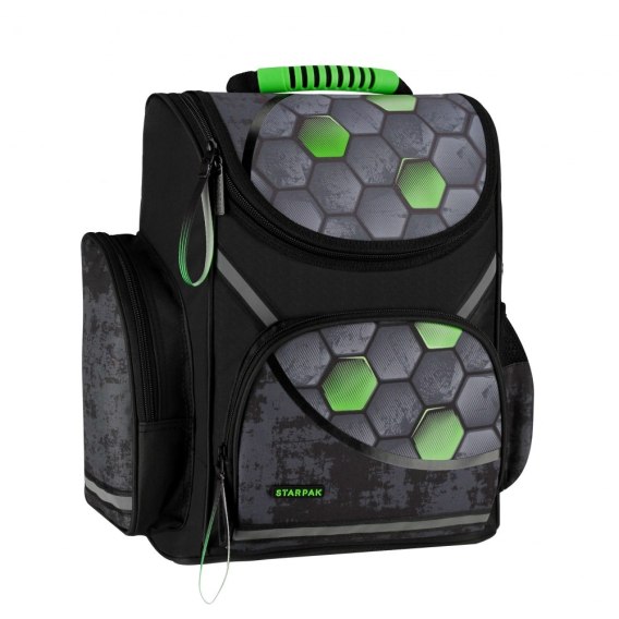 Zalety produktu: jednokomorowy tornister typu hardbag wyposażony jest w system ergonomicznych pleców i ramion pokrytych gąbką zapewniającą swobodny przepływ powietrza i komfort użytkowania. Posiada wewnętrzny organizer, który ułatwia utrzymanie porządku. Dodatkowo, tornister został wyposażony w obszerną, przednią kieszeń na zamek i dwie mniejsze kieszenie boczne, z których jedna zapinana jest na zamek, a druga wykonana z siateczki jest idealna na bidon lub butelkę z napojem. Usztywniany, pokryty gumą dół zabezpiecza przed brudem i wilgocią. Z przodu i po bokach zostały wszyte elementy odblaskowe zapewniające dziecku bezpieczeństwo. Tornister w czarno-zielonych kolorach. Wygodny i funkcjonalny Tornister szkolny STARPAK z grafiką Football. Użytkowanie takiego plecaka to czysta przyjemność. Zapoznaj się również z innymi produktami STARPAK z tej serii. Produkt jest wyrobem tekstylnym. Przeznaczony dla dzieci w wieku: 3 . Wymiary produktu wys. x szer. x gł. cm : 37x32x22, pojemność tornistra 18l, waga produktu kg : 0,88 kg. Tornister pakowany w folię.