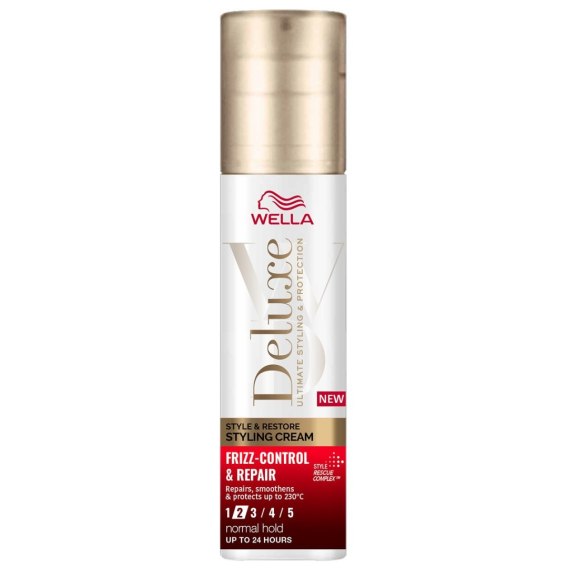 Krem do stylizacji Wella Deluxe Frizz Control & Repair pomaga odbudować włosy od wewnątrz. Przywraca włosom gładkość i połysk. Formuła nie zawiera składników pochodzenia zwierzęcego.