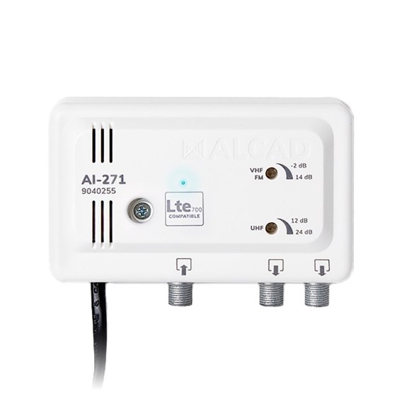 ---------- Dane techniczne ---------- Wejścia: 1 Wyjścia: 2 VHF ---------- Zakres częstotliwości: 40-318 MHz Wzmocnienie: 14 db +/-2 dB Regulacja wzmocnienia: 16 dB Współczynnik szumów: < 4 dB UHF ---------- Zakres częstotliwości: 470-696 MHz Wzmocnienie: 24 db +/-2 dB Regulacja wzmocnienia: 12 dB Współczynnik szumów: < 5 dB ---------- Tłumienie pasma LTE: 35 dB Zasilanie: 230 V +/-10% AC, 50/60Hz Temperatura pracy: -5 ~ 60 stopni C Stopień ochrony: IP30