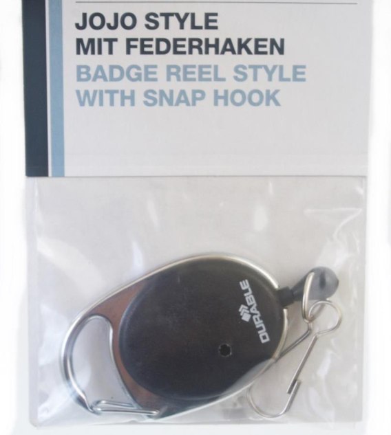 Stylowy owalny mechanizm ściągający z metalowym mechanizmem mocującym typu karabińczyk. Umożliwia szybki i łatwy dostęp do karty lub identyfikatorów DURABLE z otworami na klip lub agrafkami.