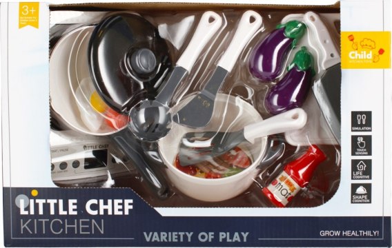 Zalety produktu: rozwijanie wyobraźni dziecka, imitujący prawdziwe naczynia kuchenne zestaw z kuchenką zachęca do zabawy. Przyrządzanie posiłków, kawki, herbatki, obiadu przy pomocy garnków oraz akcesoriów kuchennych MEGA CREATIVE to czysta przyjemność. Indukcyjna kuchenka z funkcją dźwięku i światła -cyfrowy wyświetlacz na pewno jeszcze bardziej zachęca dziecko do zabawy tym fantastycznym zestawem . Bez obaw możesz także powierzyć swojemu dziecku zadanie umycia naczyń po posiłku - mogąc się wykazać, na pewno zrobi to z uśmiechem na ustach Zawartość zestawu: kuchenka indukcyjna, garnek, patelnia z pokrywką, deska do krojenia plus nóż,2x podbierak, ketchup w butelce, bakłażan, parówka. Wszystkie produkty są imitacją prawdziwych, wykonane z plastiku Wymiary/waga/baterie: wymiary produktu dł. x wys. x gł. cm : -czajnik 14x13x13 wymiary opakowania dł. x wys. x gł. cm : 39x25x15, waga produktu bez opakowania kg : 0,53 kg, waga produktu w opakowaniu kg : 0,79 kg, Wymaga zasilania bateriami 3x AALR06/1,5V nie załączonymi do zestawu. Zestaw przeznaczony dla dzieci w wieku: 3 . Zestaw pakowany w kartonik z okienkiem. W kartonie zbiorczym po 8/16 szt.