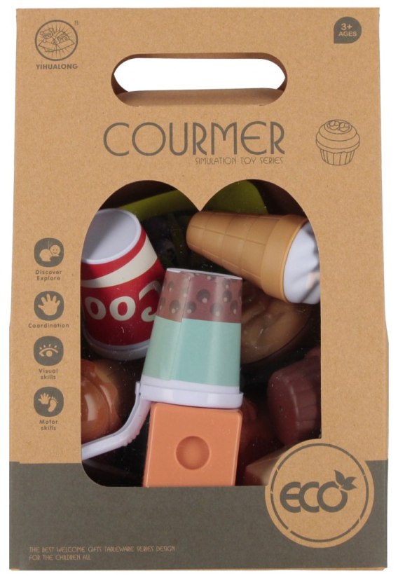 Zalety produktu: dziecko może nauczyć się podstawowych czynności domowych jakim jest np. gotowanie, poznawanie różnych kultur i obyczajów, rozwijanie pasji i kreatywności. W Zestawie Kuchennym MEGA CREATIVE znajduje się wszystko, czego potrzebuje Twoja pociecha aby zaspokoić swój głód. Może patrząc na te smakołyki również skusisz się na wspólną zabawę Zawartość zestawu: tacka, 2 x makaroniki, 2 x babeczki, 3 x kawałki ciasta, 3 x pralinki, 2 x lody, 2 x napoje, sztućce. Wszystkie produkty są imitacją prawdziwych. Produkty wykonane z plastiku. Wymiary/waga/baterie: wymiary produktu w opakowaniu dł. x wys. x gł. cm : 16x25x9, waga produktu bez opakowania kg : 0,15 kg, waga produktu w opakowaniu kg : 0,21 kg, nie wymaga zasilania bateriami. Zabawka przeznaczona dla dzieci w wieku: 3 . Zestaw pakowany w kartonową torebkę. W kartonie zbiorczym po 36 szt.