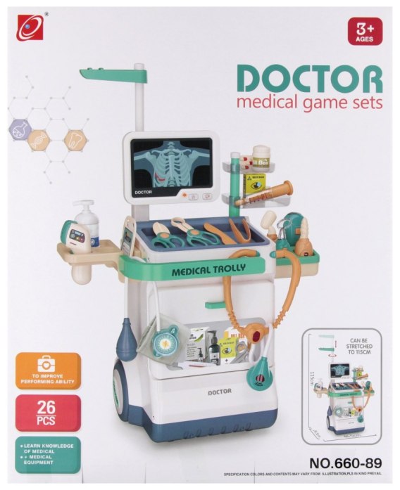 Zalety produktu: zestaw zawiera 26 elementów, pobudza wyobraźnie dziecka, nauka opieki nad chorym, rozwija kreatywność dziecka, posiada efekty dźwiękowe oraz świetlne- stetoskop posiada odgłos bicia serca oraz pulsującą czerwoną lampkę, termometr również. MEGA CREATIVE przedstawia Zestaw Lekarski ze wszystkimi niezbędnymi przyrządami lekarskimi. Z tym zestawem, wszyscy pacjenci zostaną wyleczeni Zawartość zestawu m. innymi: stetoskop, ciśnieniomierz, termometr, nożyczki, strzykawka, pęseta oraz dodatkowe akcesoria. Całość wykonana z plastiku oraz kartonu. Wymiary/waga/baterie: wymiary produktu dł. x wys. gł. cm : 47x115x27, wymiary opakowania dł. x wys. x gł. cm : 38x47x13, waga produktu bez opakowania kg : 1,47 kg, waga produktu w opakowaniu kg : 1,67 kg, wymaga zasilania bateriami 2 x AAALR03-nie załączono do zestawu, 4 x AG10- załączono do zestawu. Zestaw przeznaczony dla dzieci w wieku: 3 . Pakowany w karton. W kartonie zbiorczym po 12 szt.