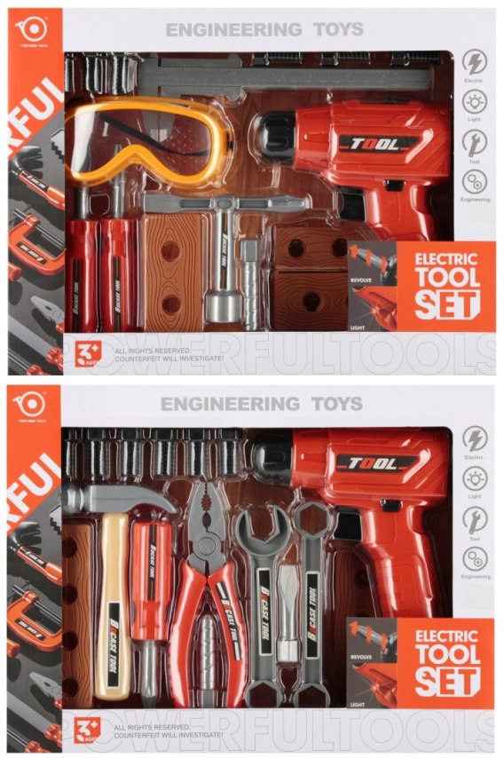 Zalety produktu: nauka używania narzędzi warsztatowych, rozwijanie zdolności manualnych, wiertarka posiada efekty dźwiękowe oraz świetlne. Zestaw Narzędzi MEGA CREATIVE to podstawowy element wyposażenia w pracy małego majsterkowicza. Dzięki niemu każde dziecko nauczy się jak przykręcać śrubki czy poprawnie wbijać gwoździe Zestaw występuje w dwóch wzorach. Zawartość zestawu: zestaw nr 1- wiertarka, gogle, 2 x śrubokręty, suwmiarka, deseczki, 6 x śrubki, klucz 3w1, zestaw nr.2- wiertarka, kombinerki, 2 rodzaje kluczy, śrubokręt, młotek, deseczka, 6 x wkręty, końcówka do wiertarki. Zabawka wykonana z plastiku. Uwaga wysyłka losowo. Wymiary/waga/baterie: wymiary produktu dł. x wys. x gł. cm : wiertarka-14x16x5, wymiary opakowania dł. x wys. x gł. cm : 33x25x6, waga produktu bez opakowania kg : 0,31 kg, waga produktu w opakowaniu kg : 0,43 kg, wymaga zasilania bateriami 2 x AALR06- nie załączono do zestawu. Zestaw przeznaczony dla dzieci w wieku: 3 . Pakowany w kartonik z okienkiem. W kartonie zbiorczym po 36 szt.