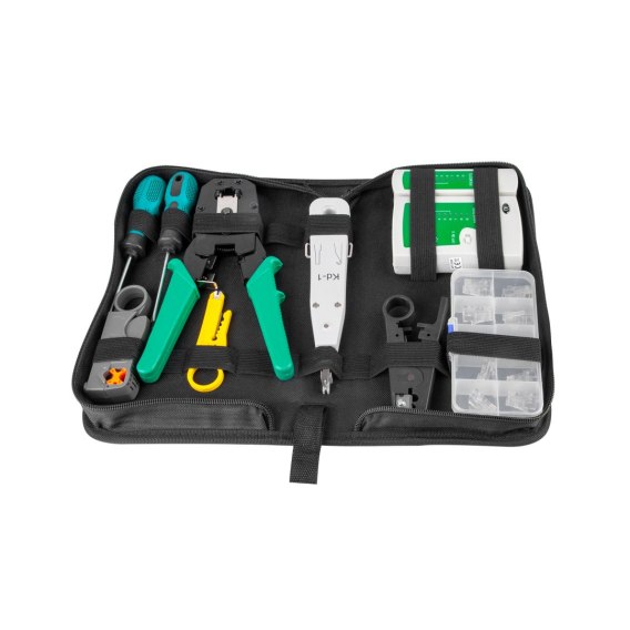 Zestaw narzędzi sieciowych 10-częścowy, służący do budowy okablowania sieciowego oraz telefonicznego (RJ45, RJ11, RJ12) w poręcznym zamykanym futerale.