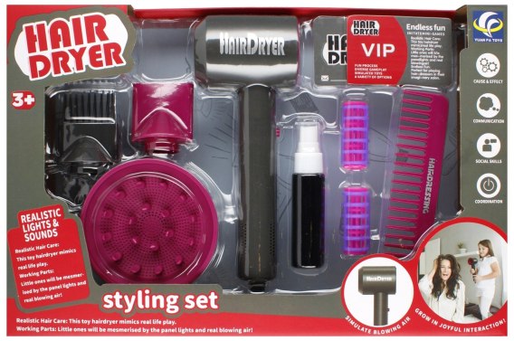 Zalety produktu: rozwija kreatywność dziecka, pozwoli dziecku wczuć się w rolę prawdziwego fryzjera. Zestaw fryzjerski do tworzenia stylizacji fryzjerskich . Zawartość zestawu: suszarka do włosów 3 nakładki, grzebień, 2x wałek do włosów, buteleczka-spray do włosów, 2x karta VIP. Zestaw wykonany z plastiku i kartonu. Suszarka wydaje dźwięk prawdziwej suszarki podczas suszenia włosów. Wymiary/waga/baterie: wymiary opakowania dł. x wys. gł. cm :29x26x7, wymiary produktu dł. x wys. x gł. cm -suszarka 8x23x6, waga produktu bez opakowania kg : 0,27 kg, waga produktu w opakowaniu kg : 0,41 kg, Wymaga zasilania bateriami -suszarka do włosów 2x AALR06- nie załączone do zestawu. Zestaw przeznaczony dla dzieci w wieku: 3 . Pakowany w kartonik z okienkiem. W kartonie po 21/42 szt.