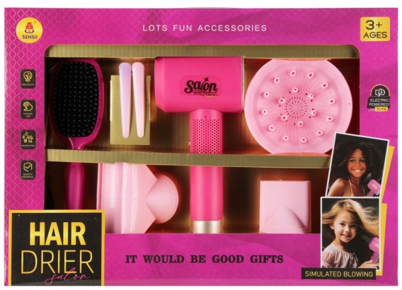 Zalety produktu: rozwija kreatywność dziecka, dziecko może poczuć się jak mała Księżniczka. Zestaw Piękności to podstawowa pozycja w kolekcji zabawek każdej dziewczynki, wchodzącej coraz większymi krokami w życie. Akcesoria MEGA CREATIVE wydobędą z niej prawdziwą młodą damę Suszarka posiada efekt dźwiękowy suszenia. Zawartość zestawu: suszarka do włosów, dyfuzor do loków, grzebień i szczotkę do włosów, nożyczki do strzyżenia, spinki. Wykonane z plastiku, wszystkie produkty są imitacją prawdziwych. Wymiary/waga/baterie: wymiary produktu dł. cm : suszarka do włosów 24 cm, waga produktu bez opakowania kg : 0,34 kg, waga produktu w opakowaniu kg : 0,49 kg, wymaga zasilania bateriami 3 x AAALR03- nie załączono do zestawu. Zestaw przeznaczony dla dzieci w wieku: 3 . Pakowany w karton z okienkiem. W kartonie zbiorczym po 36 szt.