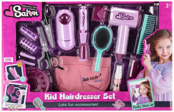 Zalety produktu: Zestaw piękności Salon fryzjerski MEGA CREATIVE. Spełnij marzenia małych stylistów Ten kompletny zestaw fryzjerski pozwala dziecku stworzyć własny salon piękności i eksperymentować z włosami, makijażem oraz dodatkami. Dzięki realistycznym akcesoriom zabawa staje się nie tylko kreatywna, ale i edukacyjna, rozwija wyobraźnię, zdolności manualne oraz poczucie estetyki. To świetny pomysł na prezent dla małych miłośników mody i fryzjerstwa godziny wspaniałej zabawy gwarantowane Produkt wykonany z plastiku i materiału i skaju. Zawartość zestawu: suszarka nakładka na suszarkę, pas na narzędzia, prostownica, 2x wałki do włosów, 2x klamry do włosów, 2x nożyczki, dyfuzor, maszynka do strzyżenia, grzebień szczotka, lakier do włosów. Wymiary/waga/ baterie: wymiary opakowania dł. x wys. x gł. cm : 50x33x10, wymiary produktu: dł. x wys. x gł. cm -suszarka 9x16x5, waga produktu bez opakowania kg : 0,41 kg, waga produktu w opakowaniu kg : 0,61 kg,, wymaga zasilania bateriami: - suszarka 2x AALR06- nie załączonymi do zestawu, -prostownica 3xAG13-załaczonymi do zestawu. Zestaw przeznaczony dla dzieci w wieku: 3 . Pakowany w karton z okienkiem. W kartonie zbiorczym po 12/24szt