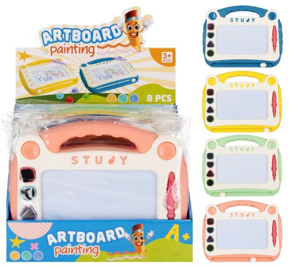 Zalety produktu: w zależności w której jego części powstanie rysunek, będzie on w jednym z czterech kolorów, rozwija kreatywność dziecka, pobudza wyobraźnię. Kolorowy Znikopis to najlepszy pomysł na naukę rysowania Twojego dziecka. Nie musisz się przejmować czy linia będzie prosta czy krzywa, jeżeli coś nie wyjdzie, łatwo zmażesz to jednym ruchem. Ten Znikopis posiada specjalną powłokę Znikopis MEGA CREATIVE z akcesoriami to być może powierzchnia, na której powstanie pierwsze dzieło sztuki Twojej pociechy Zawartość zestawu: znikopis magnetyczny, długopis oraz 2 pieczątki. Występuje w czterech wersjach. Wymiary/waga/baterie: wymiary produktu dł. x wys. x gł. cm : 30x23x3, wymiary opakowania display dł. x wys. x gł. cm : 31x23x22, waga produktu bez opakowania kg : 0,22 kg, waga displaya kg : 2,02 kg, nie wymaga zasilania bateriami. Zabawka przeznaczona dla dzieci w wieku: 3 . Znikopis pakowany w folię. W display po 8 szt.